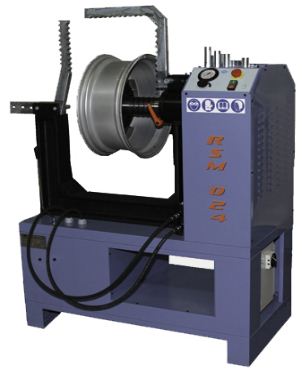 Принцип действия: Диск закрепляется на валу станка, а затем воздействуют на его деформированные части с помощью различных насадок, устанавливаемых на шток силового гидроцилиндра. При этом конструкция станка позволяет воздействовать практически на любую точку диска и в любом направлении с дозированным усилием. По существу, эти станки представляет собой специализированные стапели для правки колесных дисков диаметра от 13" до 24". Станки оснащены, также, токарным модулем, что позволяет осуществлять токарную доработку диска после его правки.