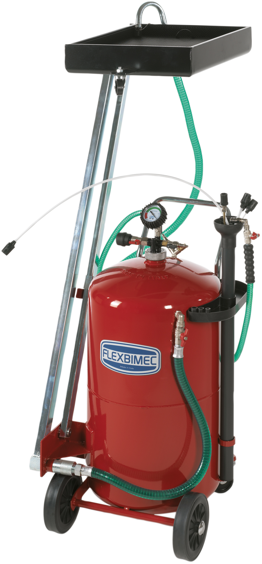 Передвижной резервуар для отсоса и слива отработанного масла, объемом 90 л с 10-ти литровой чашей с пантографом из окрашенной стали оснащен индикатором уровня, комплектом из 6-ти зондов разных диаметров для отсоса и инструментальным лотком.
