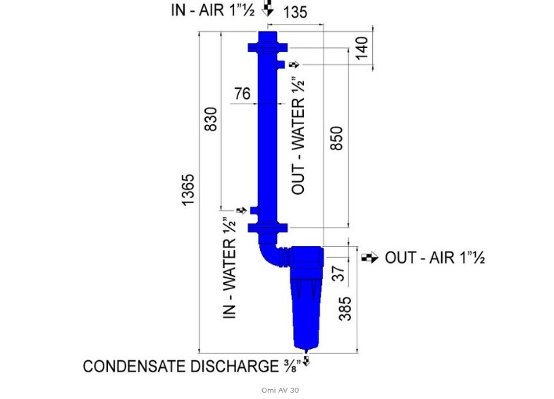 Доохладитель сжатого воздуха Omi AV 30 используется для предварительного охлаждения подаваемого компрессором сжатого воздуха высокой температуры. Эксплуатируется в пневмосистемах как самостоятельно, так и в составе с осушителями, так как последние не допускают эксплуатацию при горячем входящем воздухе, за исключением специальных моделей. Можно даже сказать, что оконечные охладители воздуха, в некотором роде, также являются осушителями воздуха, с более высокой температурой точки росы. Влага, содержащаяся в сжатом воздухе, удаляется в циклонном сепараторе, на выходе их охладителя AV 30.
