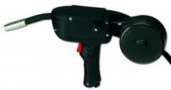 Приводная горелка SPOOL GUN используется в основном для сварки алюминия, когда имеется большое расстояние между генератором тока и свариваемой деталью. Алюминиевая проволока очень мягкая и легко поддается обработке, и при длине свыше 3 метров может быть затруднено ее прохождение внутри рукава обычной горелки, направляющего проволоку. Приводная горелка СПУЛ ГАН, с механизмом подачи и бобиной проволоки внутри горелки, легко разрешает прблему движения проволоки. Также она может использоваться для сварки с проволокой из стали и порошковой проволокой.