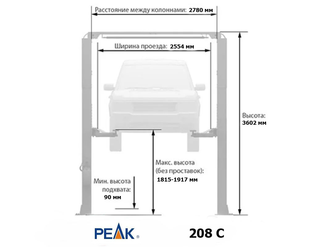 Автомобильный двухстоечный подъемник PEAK 208C с верхней синхронизацией удобен и надежен в эксплуатации при проведении самых различных слесарных работ в условиях автосервиса, СТО, гаражной мастерской.