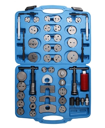Набор для ввинчивания поршня тормозного цилиндра, 50 предметов предназначен для оперативной и, в то же время, аккуратной замены тормозных колодок у различных видов автомобилей: грузовых, легковых, пассажирских, и т.д. Комплект исключительно прост в использовании: для демонтажа необходимой детали нужно осуществить буквально пару действий - вращая рукоятку входящего в набор приспособления, задвинуть поршень тормозного цилиндра.