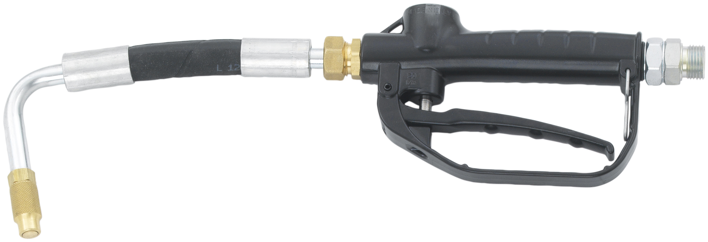 Раздаточный пистолет для масла с гибким резиновым носиком, жестким, изогнутым на 90° автоматическим наконечником с каплеотсекателем и поворотным соединением 1/2” BSP.