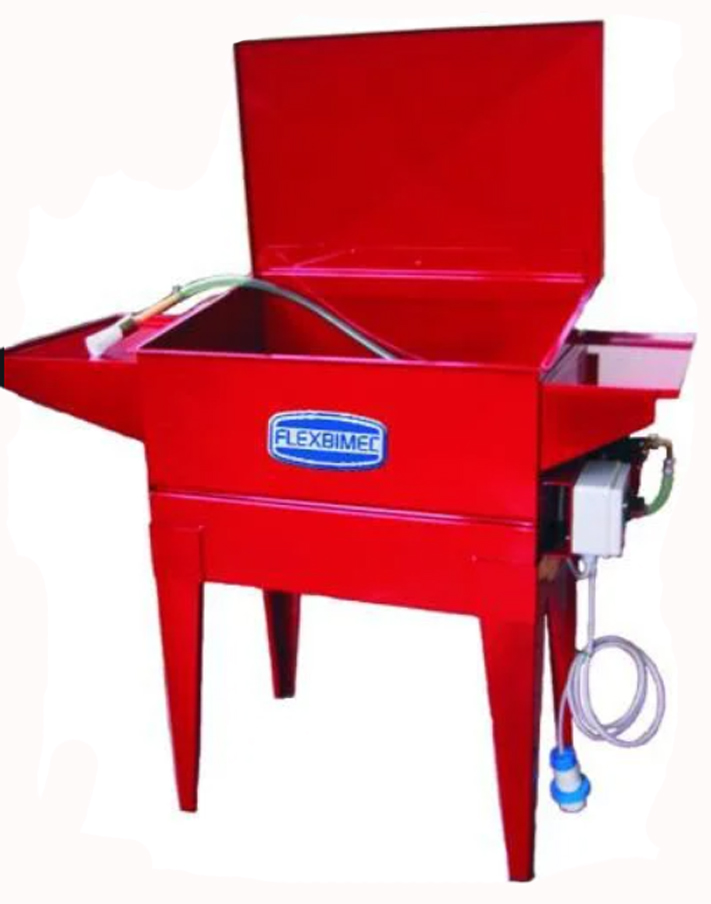 Стационарная моечная ванна с замкнутым циклом из окрашенной стали, с системой рециркуляции жидкости на 0,5 бар за счет погружного электронасоса. Оснащена шлангом с душевой насадкой, шлангом с кистью, имеющей жесткую щетину, пропускающей жидкость, что позволяет непрерывный поток жидкости и тщательную очистку деталей. Имеет съемную крышку. Примечание: Использовать только специальные средства для промывки механических частей.