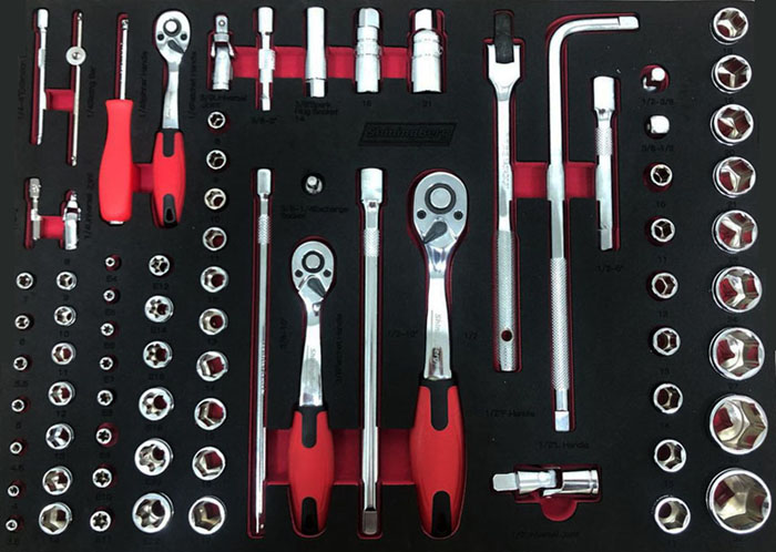 Набор инструмента состоит из 323 предметов, расположеных в пяти ложементах.